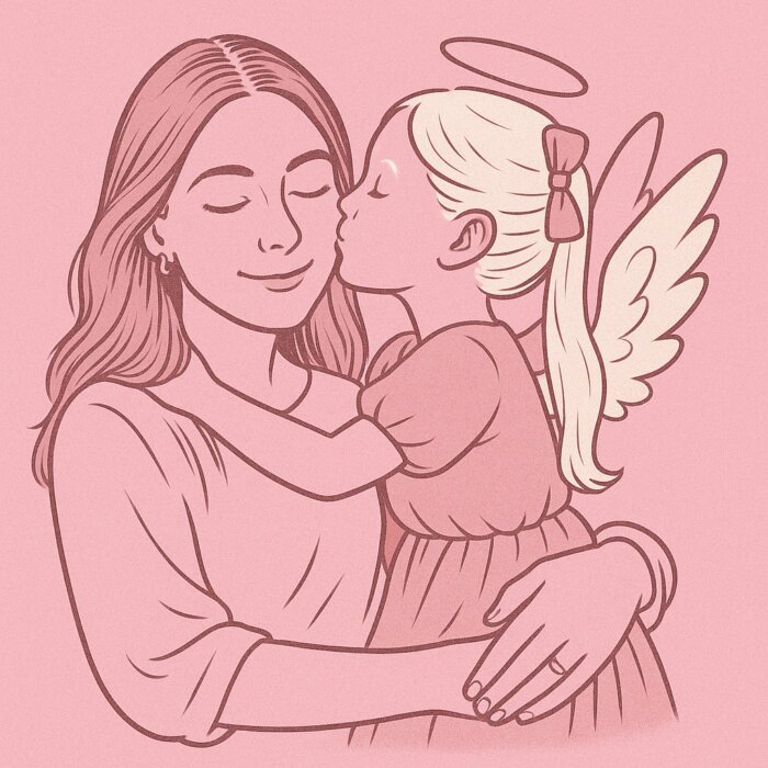 Dan ineens zie ik mijn dochter in de deuropening. Vier jaar oud, bloemenpyjama aan, haar blonde haren warrig en haar tuttie onder haar arm.