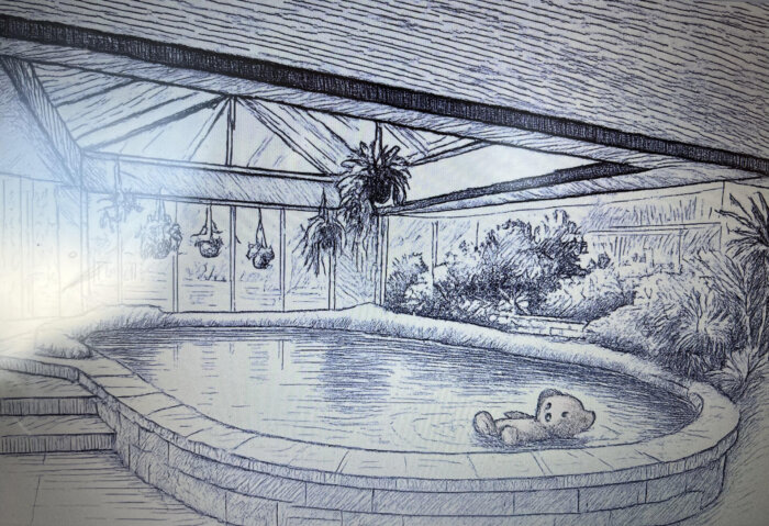 Potdomme, waarom hebben ze ook altijd van die trage draaideuren in ziekenhuizen. Ik wurm me door de opening en storm de centrale hal in. Ternauwernood weet ik een golfkarretje te ontwijken. Ik neem een short-cut, sprint de trap op en duw de klapdeuren open. Hijgend kom ik aan bij de fontein. Daar zit ze, op het muurtje. Ik vertraag mijn pas en zie de glinstering van muntjes op de bodem. Natuurlijk is ze hier! Ze was hier altijd. Weliswaar in een ander ziekenhuis, maar de plek is hetzelfde. Ik ga naast haar zitten, haar tere lijfje straalt kou uit. Ik kijk naar de bruine beer die in het water drijft. Er zit nog geen gat in zijn tuinbroek.